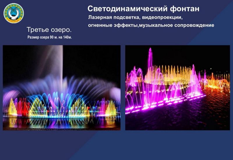 Қарағандының Орталық саябағында аумағы шамамен 750 шаршы метрді құрайтын ашық бассейн ашылып, үшінші көлдің бүкіл айдынын қамтитын музыкалық-отты жарықдинамикалық фонтан орнату жоспарланып отыр. Жоба экологияны сауықтыру, инфрақұрылымды дамыту және заманауи қоғамдық кеңістік қалыптастыруды көздейтін Орталық саябақты кешенді жаңғыртудың бір бөлігі болмақ.