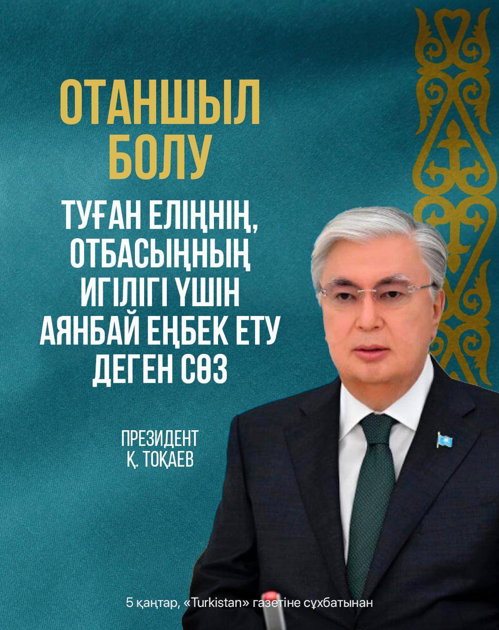 «Менің ойымша, шынайы патриотизм - айқай-шусыз, көзбояушылықсыз болады. Патриоттар көкірек соғып, жалынды сөз айтпайды, сұхбат беріп, көпшіліктің алдында көз жасын төкпейді. Оларға сөзбен әсер ету немесе театрландырылған әрекеттер тән емес. Патриот болу - ел мен отбасы игілігі үшін адал еңбек ету. Қоқыс жинау, ағаш отырғызу, табиғатты қорғау, үлкенді құрметтеп, кішіге үлгі болу - мұның бәрі патриотизмнің көрінісі», - деді Қасым-Жомарт Тоқаев.