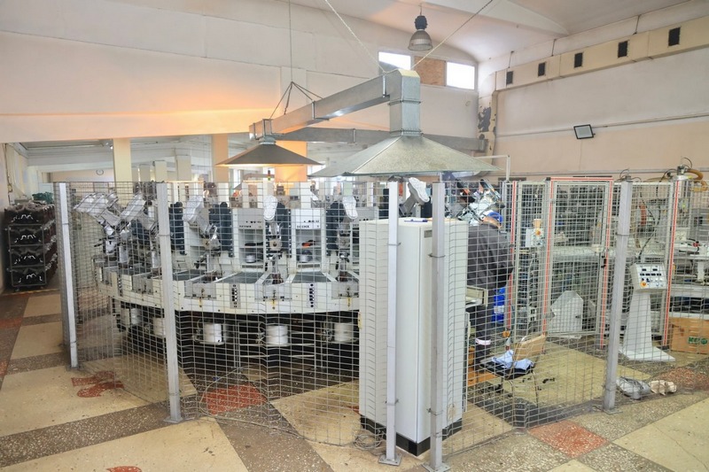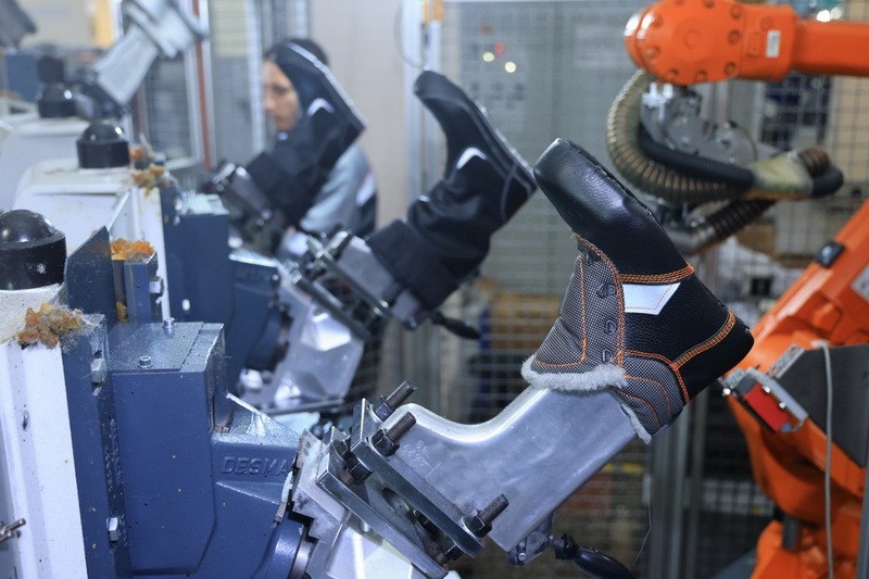 Особая гордость фабрики – литьевая машина немецкой фирмы Desma. На ней отливают двухслойную полимерную подошву. Роботизированный агрегат действует с особой точностью, подошва сцепляется с заготовкой верха обуви на молекулярном уровне.