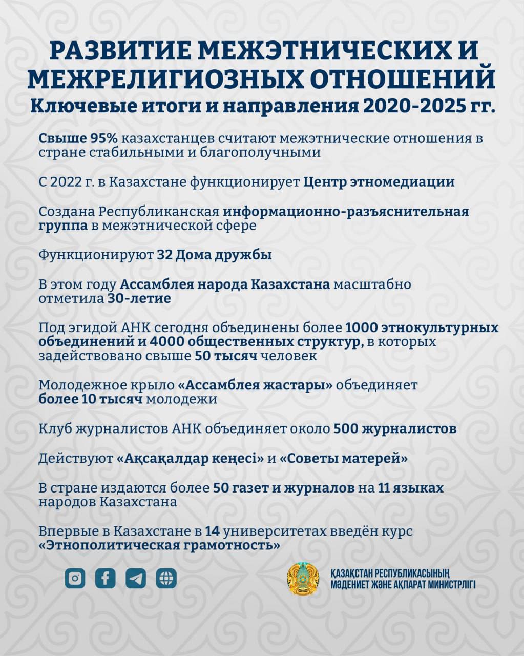 Министерство культуры и информации Республики Казахстан продолжает системную работу по укреплению общественного согласия, гражданского единства и развитию межэтнических отношений.