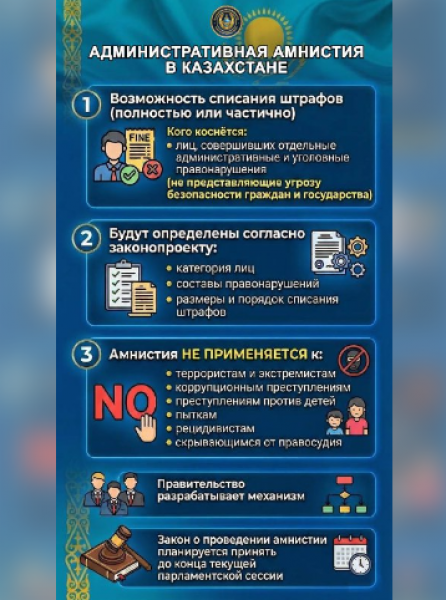 В настоящее время Министерством внутренних дел совместно с Министерством юстиции прорабатываются предложения по механизму реализации амнистии. Категории лиц, составы правонарушений, размеры и порядок списания штрафов будут определены при подготовке соответствующего законопроекта.
