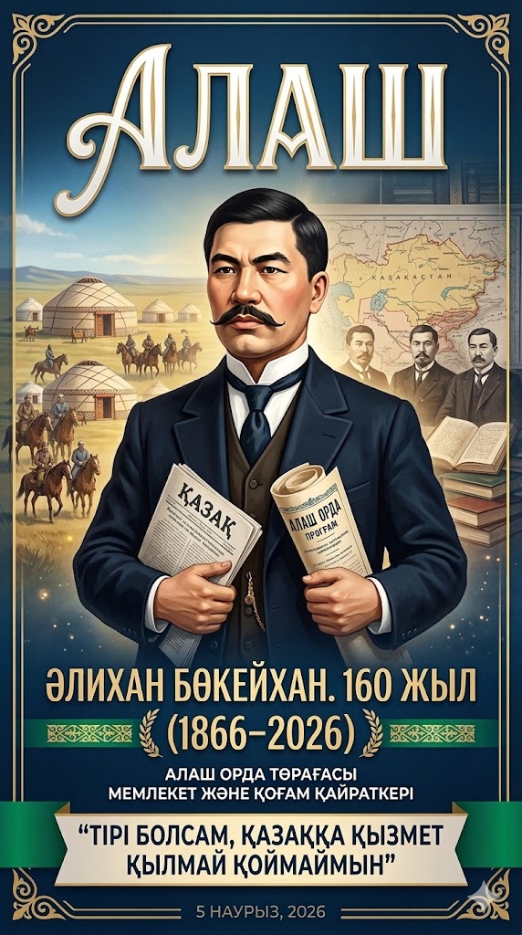 Бүгін ХХ ғасырдағы қазақ халқының ең көрнекті тұлғасы – Әлихан Бөкейханның туғанына 160 жыл толды. Ол – ел тарихында өшпес із қалдырған мемлекет және қоғам қайраткері, ұлт зиялысы, Алаш қозғалысының жетекшісі, Алашорда үкіметінің тұңғыш төрағасы.