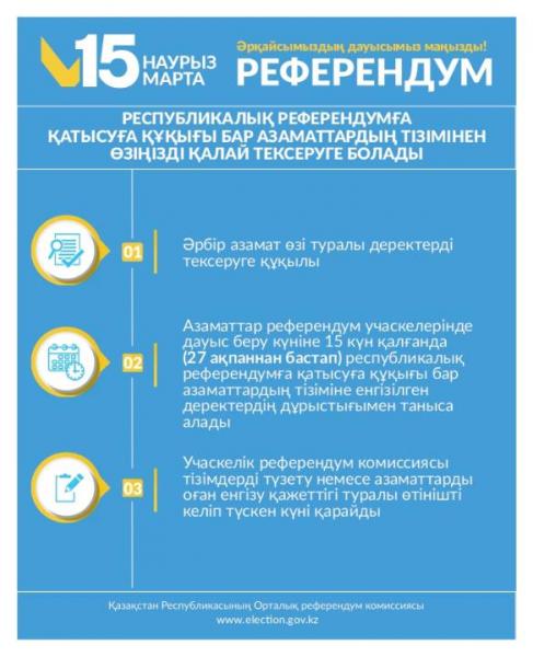 Қарағанды облысының тұрғындары өздерінің дауыс беру учаскесін және қатысушылар тізіміндегі деректерін ЖСН арқылы referendum сайтында тексере алады. Сондай-ақ Senim109 Бірыңғай байланыс орталығына (109 нөміріне қоңырау шалу арқылы) хабарласуға немесе тұрғылықты жері бойынша колл-орталықтарға жүгінуге болады: