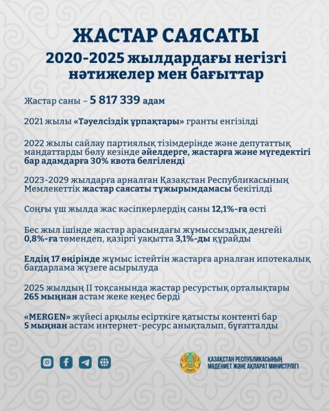 Қазақстан Республикасының Мәдениет және ақпарат министрлігі жастарды қолдауға бағытталған мемлекеттік саясатты іске асырып келеді.