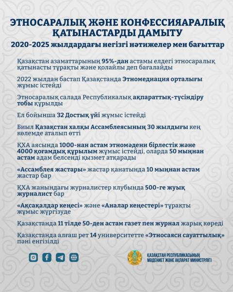 ҚР Мәдениет және ақпарат министрлігі қоғамдық келісім, азаматтық бірлік және этносаралық қатынастарды дамыту бағытындағы жұмыстарды жүйелі түрде жалғастырып келеді.