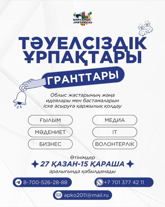 «Сізден – идея, бізден – қолдау! Жаңа бастамаларыңызды жүзеге асыру үшін қаржылай қолдауға ие болыңыз. Өңірлік «Тәуелсіздік ұрпақтары» грантын иеленіп, өз идеяларыңызды шынайы жобаға айналдырыңыз», – деп жастар саясаты мәселелері басқармасы жастарды белсенді қатысуға шақырды.