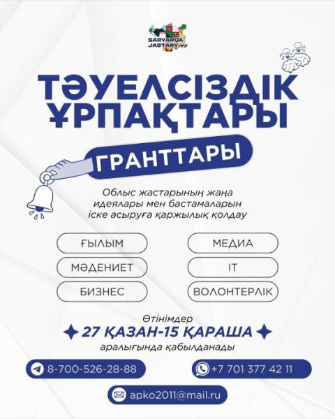 Қарағанды облысы әкімінің «Тәуелсіздік ұрпақтары» гранттары бірнеше жылдан бері табысталып келеді. Жобаның басты мақсаты – жастардың тың бастамалары мен шығармашылық идеяларын қолдау. Биыл өтінімдер қабылдау 27 қазанда басталып, 15 қарашаға дейін жалғасады.