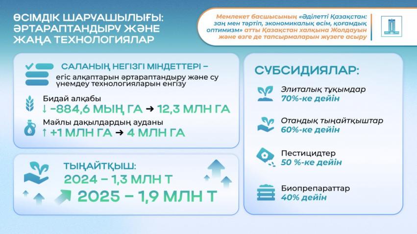 Президенттің «Әділетті Қазақстан: заң мен тәртіп, экономикалық өсім, қоғамдық оптимизм» Жолдауын және Мемлекет басшысының өзге де тапсырмаларын жүзеге асыру аясында елімізде өсімдік шаруашылығында тиімділікті арттыруға және тұрақты өндірісті дамытуға бағытталған жүйелі өзгерістер жүргізілуде.