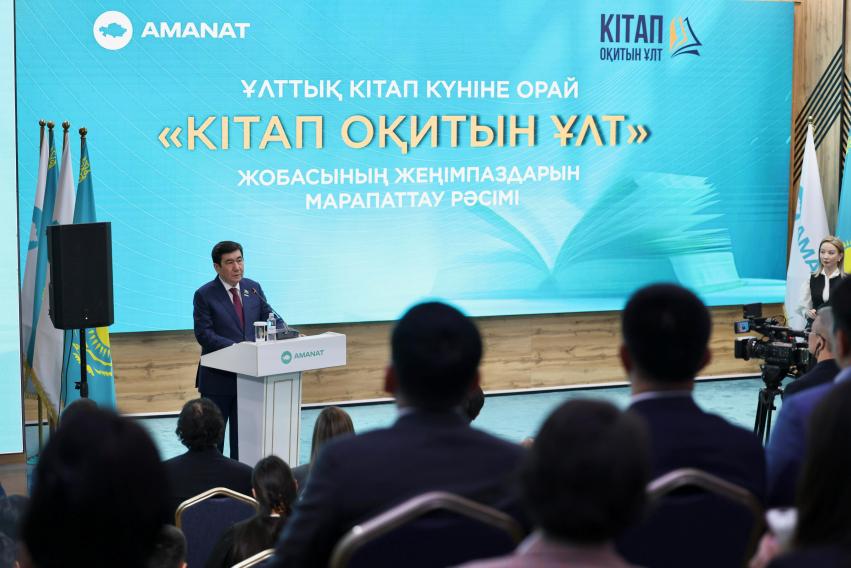 «AMANAT» партиясында Ұлттық кітап күніне орай «Кітап оқитын ұлт» жобасының жеңімпаздары марапатталды. Үш өңірде – Шымкент қаласында, Қарағанды және Қостанай облыстарында пилоттық жоба аясында 8 айда жалпы саны шамамен 2 млн кітап оқыған 190 мыңға жуық адам қамтылды. Іс-шараға Мәжіліс Спикері, «AMANAT» партиясының Төрағасы Ерлан Қошанов, сондай-ақ танымал жазушылар, қоғам қайраткерлері, шығармашылық зиялы қауым өкілдері және жоба жеңімпаздары қатысты.