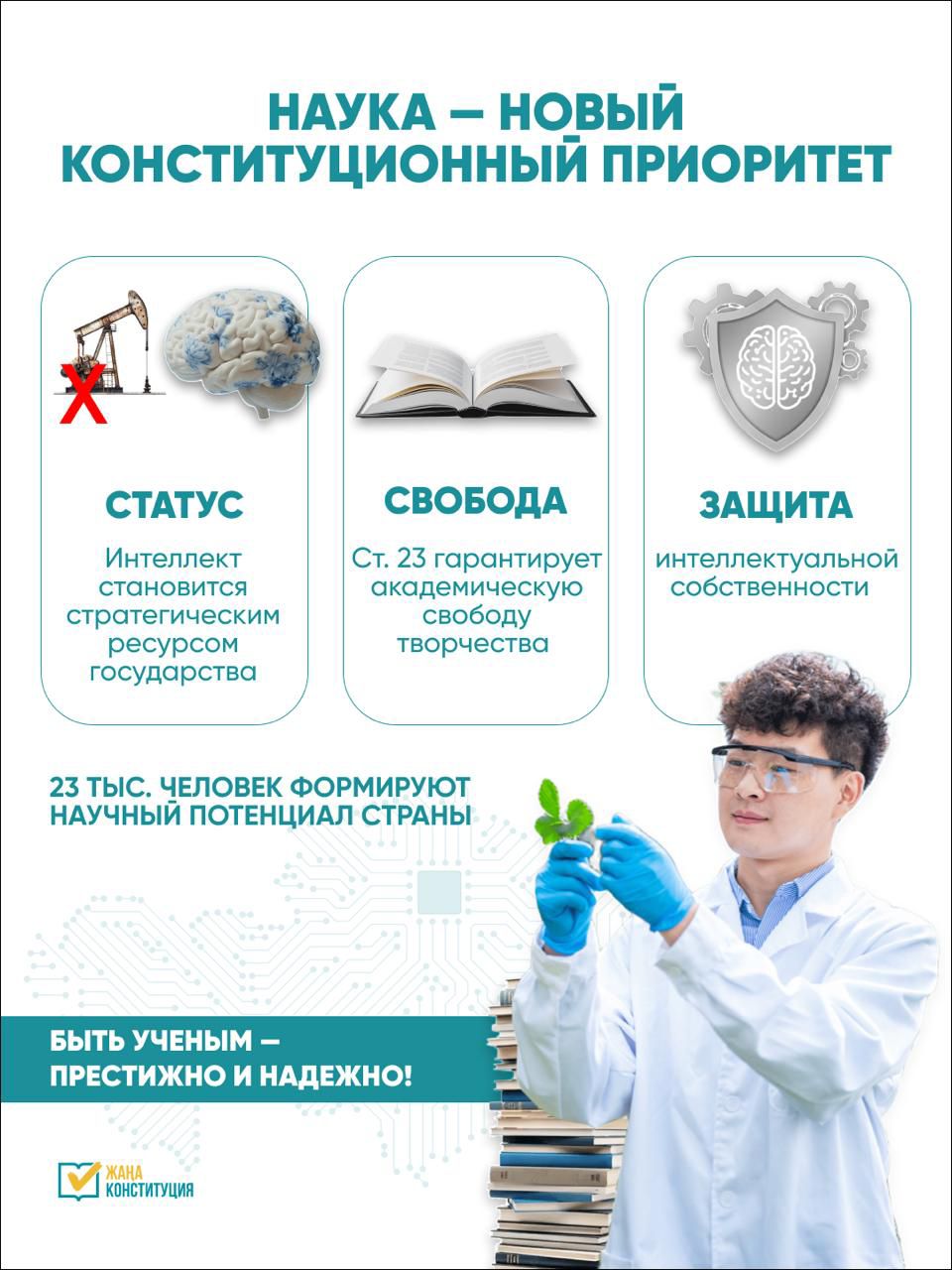 В обновленной Конституции закреплен статус науки как стратегического ресурса государства: интеллект становится основой устойчивого развития страны. Статья 23 гарантирует свободу слова, научного, технического и художественного творчества. Обеспечивается защита интеллектуальной собственности.