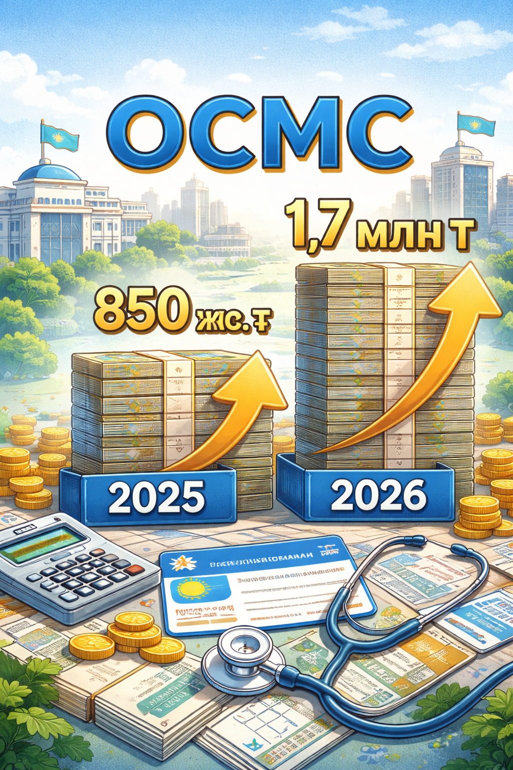 Из-за этого в 2026 году казахстанцы с большими доходами будут платить более высокие взносы на ОСМС. Например, если зарплата составляет 2 млн тенге, то в 2025 году для расчета взносов учитывается только 850 тыс., а с 2026 года в расчет будет приниматься 1,7 млн тенге.