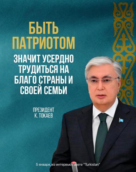 «Истинный патриотизм, с моей точки зрения, не в громких словах и показных поступках. Патриоты не кричат и не бьют себя в грудь, не раздают интервью и не пускают слезу перед публикой. Патриотам не характерна словесная бутафория и театральность. Быть патриотом – значит усердно трудиться на благо страны и своей семьи. Убрать мусор, посадить дерево, беречь природу, уважать старших и быть примером для младших – это тоже патриотизм», — сказал Касым-Жомарт Токаев.