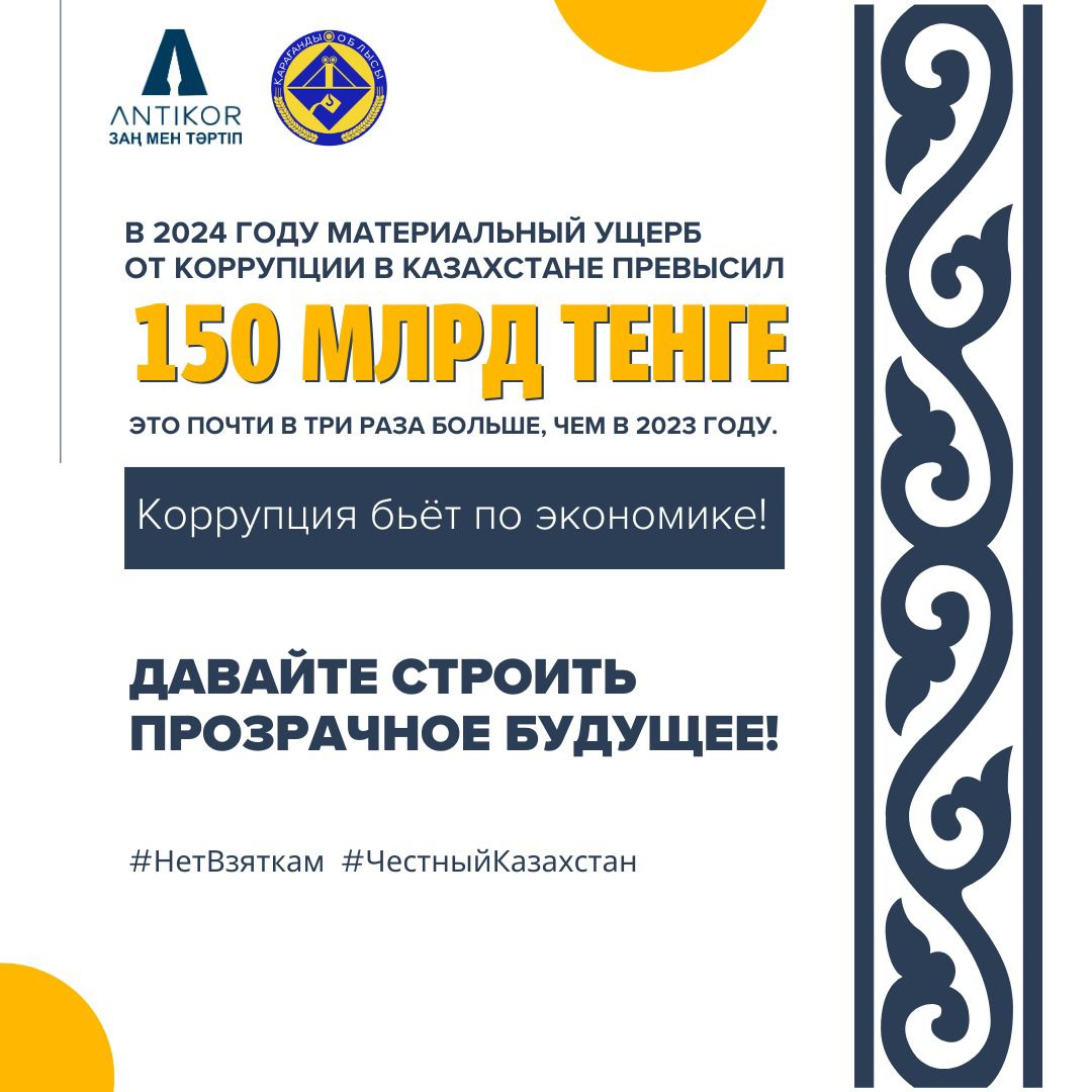 Каждый украденный тенге – это упущенные возможности для медицины, образования и развития инфраструктуры. Борьба с коррупцией требует совместных усилий. Только действуя вместе, мы сможем снизить ущерб и сделать страну прозрачнее и справедливее!
