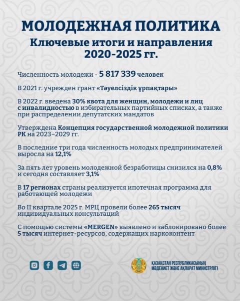 Знаковым событием стало утверждение Президентом Концепции государственной молодежной политики Республики Казахстан на 2023–2029 годы. Это системный документ, определяющий стратегические приоритеты и новые подходы к работе с этой категорией населения.
