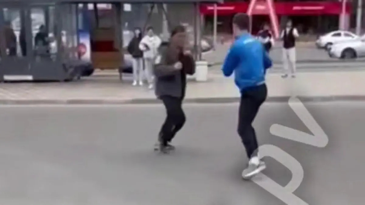 На кадрах видно, как двое молодых людей вступают в драку. Конфликт быстро перерастает в ожесточённое противостояние: один из участников, одетый в серую куртку, оказывается на земле, а его оппонент в синей ветровке наносит ему несколько ударов кулаками по лицу, из-за чего у пострадавшего начинается кровотечение.